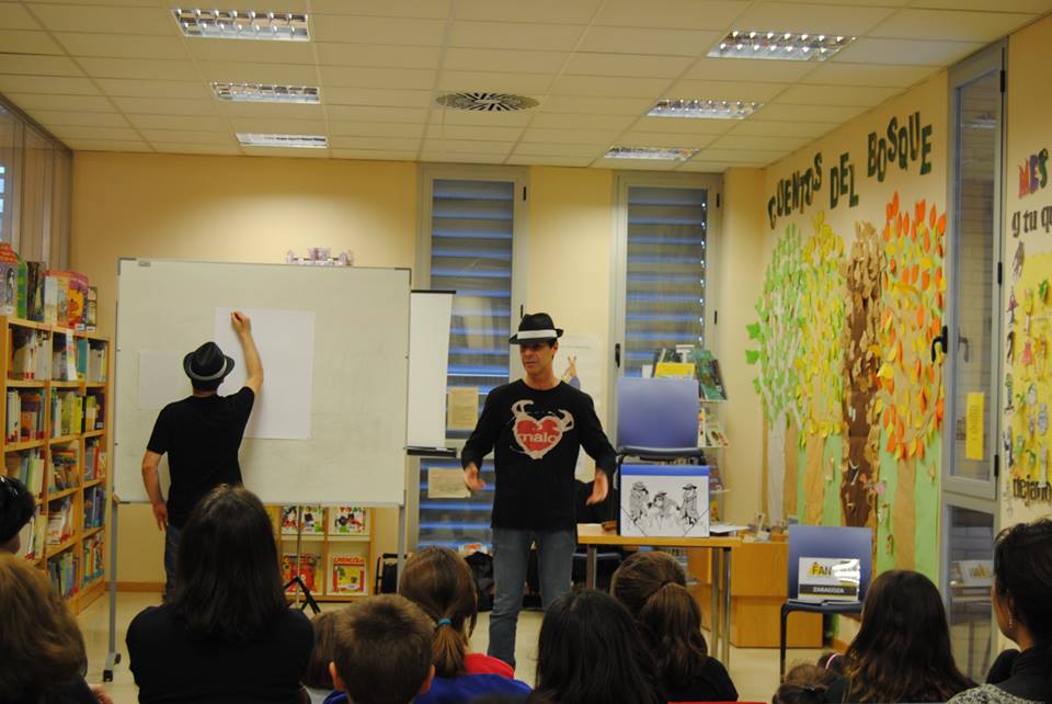 Miguel Monreal y Roberto Malo contando "Los CaraLibros" en la Biblioteca de Miralbueno.