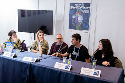 En la Sala Mortadelo, charla: "Lo desconocido", con Elisa McCausland, que moderó fantásticamente, y los autores Genie Espinosa (Tiburón blanco), Chema Cebolla y Roberto Malo (La identidad) y Laura Pérez (Nocturnos).